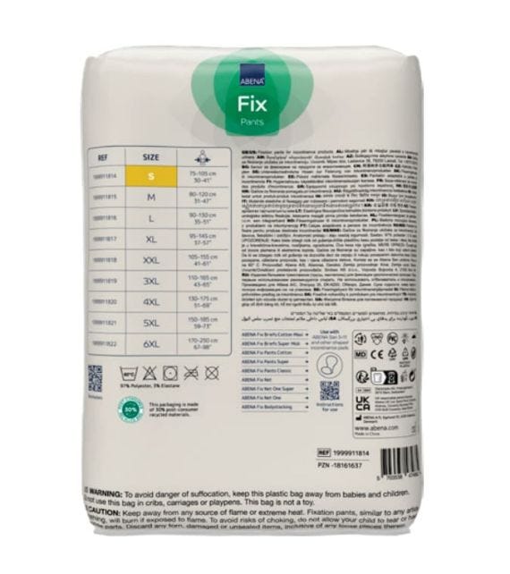 ABENA Fix Pants Super, in size small, offer breathable, ultra-soft comfort for individuals managing continence needs. The elastic, stretch-fit design securely holds pads, helping to minimize leaks while maintaining a gentle touch on the skin. The seamless, irritation-free construction is ideal for those with sensitive skin, providing all-day comfort without leaving pressure marks. Designed to resemble regular underwear, these unisex fixation pants ensure a discreet look and boost wearer confidence. Highly durable and washable up to 100 times, they provide a cost-effective and long-lasting solution. Suitable for waist sizes 65-100cm, ABENA Fix Pants Super combine practicality with dependable protection.