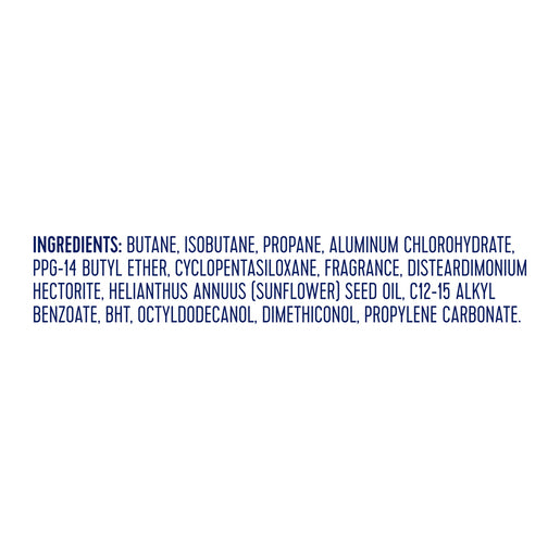 Contains: butane, isobutane, propane, aluminum chlorohydrate, fragrance, sunflower seed oil, and additional skin-conditioning agents.